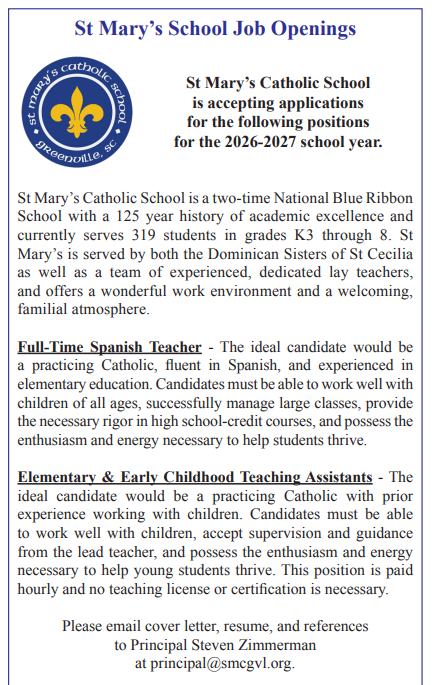 Catholic Jobs in the Upstate of SC Have a job you would like posted here? Email upstatecatholiccompass@gmail.com